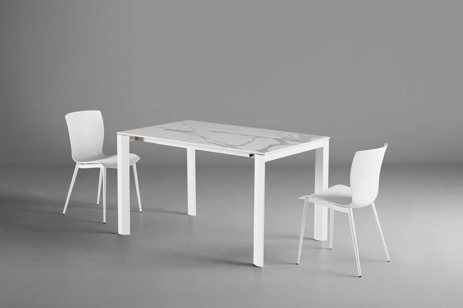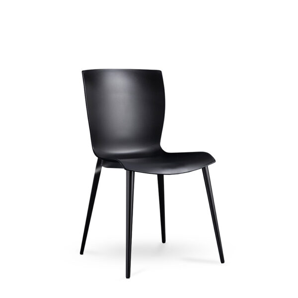 Sedia moderna con gambe conificate in acciaio, seduta in polipropilene.